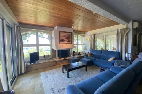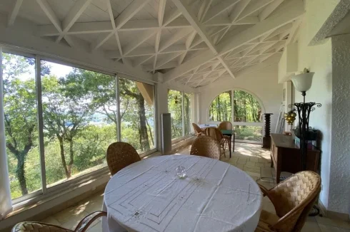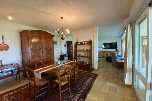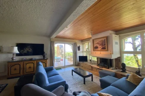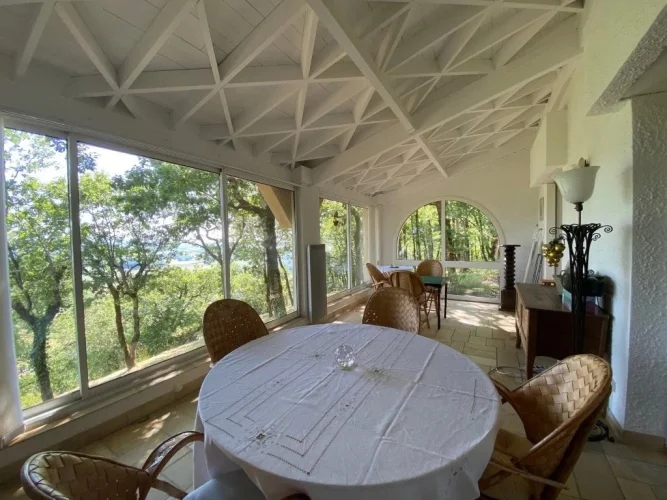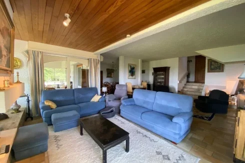 A 38.5 m² lounge with fireplace + wood burner, stone floor, bay window opening on to a terrace and swimming pool with views.