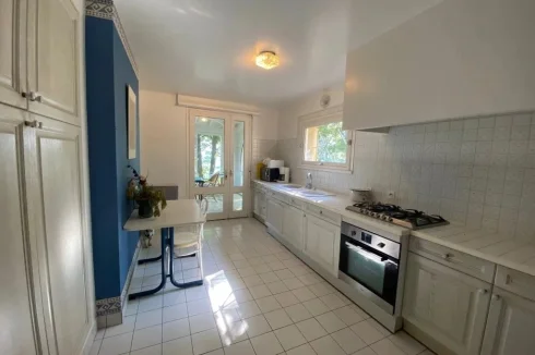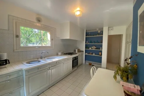 A 13.5 m² kitchen, double sink, walls and floor cupboards, domestics appliances, tiled floor.