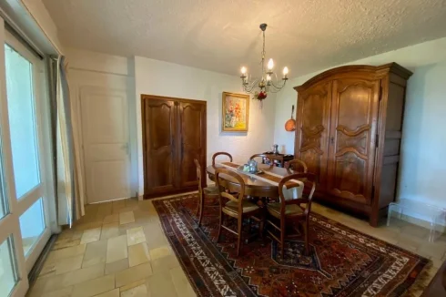 A 18 m² dining room, built-in cupboard, stone floor.