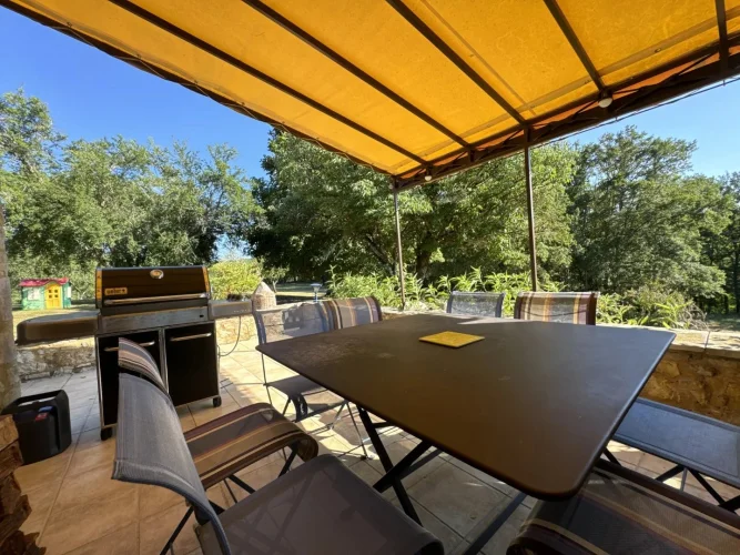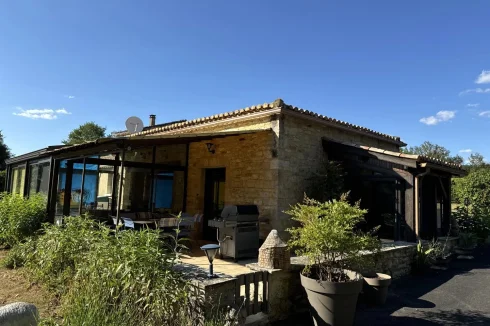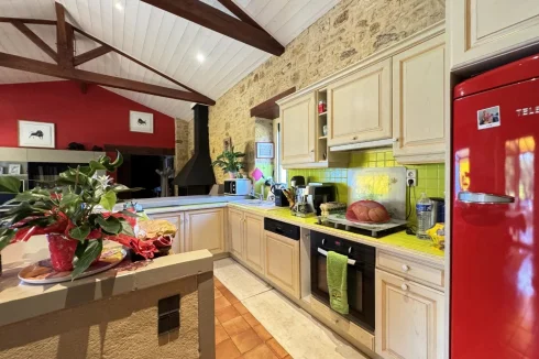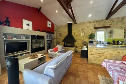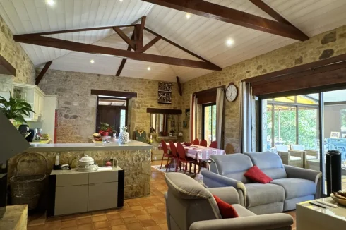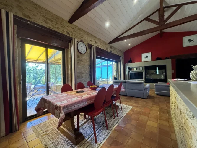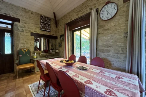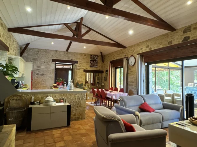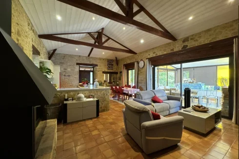 This traditionally-built stone house offers approx. 140 m² of living space on one level. It comprises a spacious living room with high ceilings, an open fitted kitchen, fireplace and direct access to a covered terrace and veranda. The sleeping area comprises 4 bedrooms, including a master suite with dressing room and shower room, and an additional family shower room. The adjoining dovecote houses the boiler room and an office. This functional home combines authentic charm with modern comforts.
