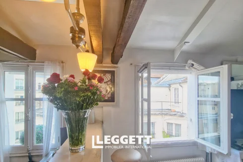 This atypical loft is the only one on the floor, via a listed staircase, of a well-maintained and secure 1830 building, with a beautiful flower-filled paved courtyard and bicycle park. It is ideally nestled in a quiet area away from the hustle and bustle of the city and features 3 large windows and 3 Velux windows opening wide to the legendary roofs of Paris.