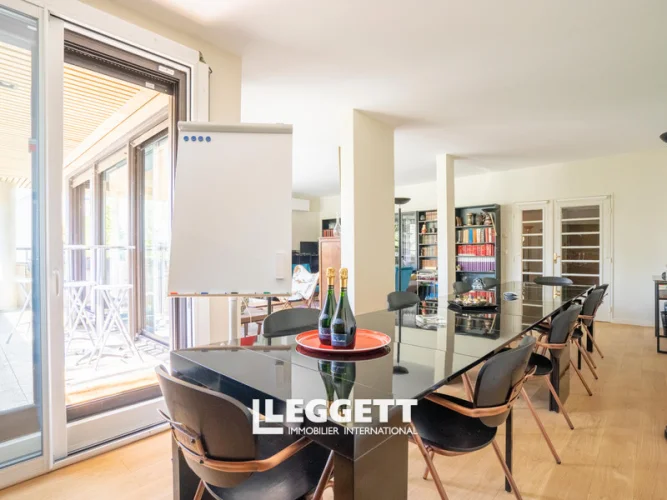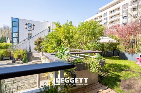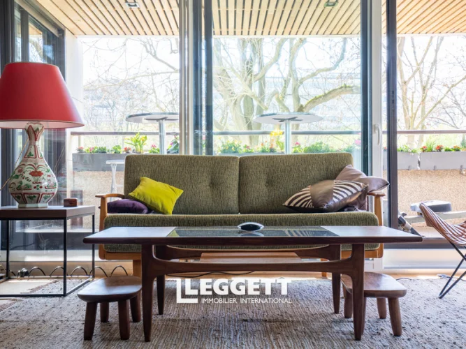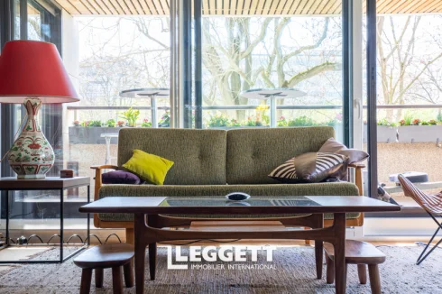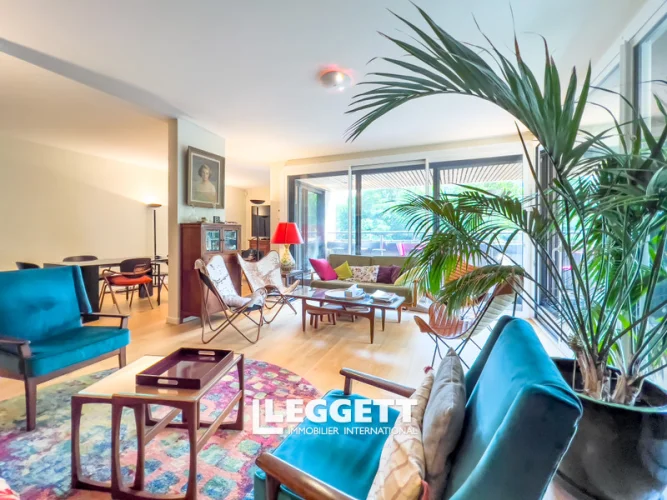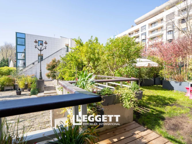 Ile de la Jatte 92, modern 2 bed apartment, 107,47m2 + garden 59m2, overlooking the Seine, imm 1990 with lift - L'Ile de la Jatte, a residential enclave and a veritable green interlude on the Seine, a bright, luxury 2 bedrooms apartment, not overlooked by neighbours, 107m2 + 59m2 SE terrace/garden facing the Seine. Accessed via an almost car-free paved alley, on the 1st floor of a small, secure, well-maintained residence (6 flats) built in 1990 with lift. It boasts spacious rooms and a pretty, bucolic view over the moored barges.