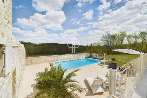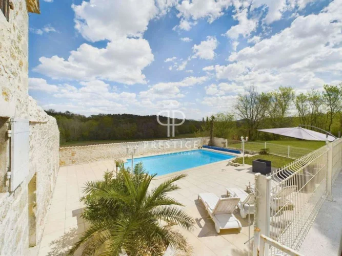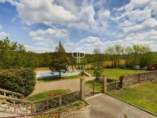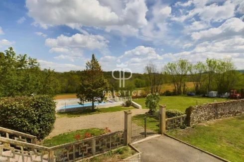 The ensemble sits in a fully enclosed park, planted with fruit trees, swimming pool with its terraces, well, quiet environment, with views over the countryside.