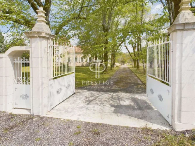 An elegant gate with its imposing stone pillars, gives access to a park of 19200 M2, planted with bicentennial species, entirely fenced.