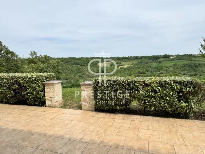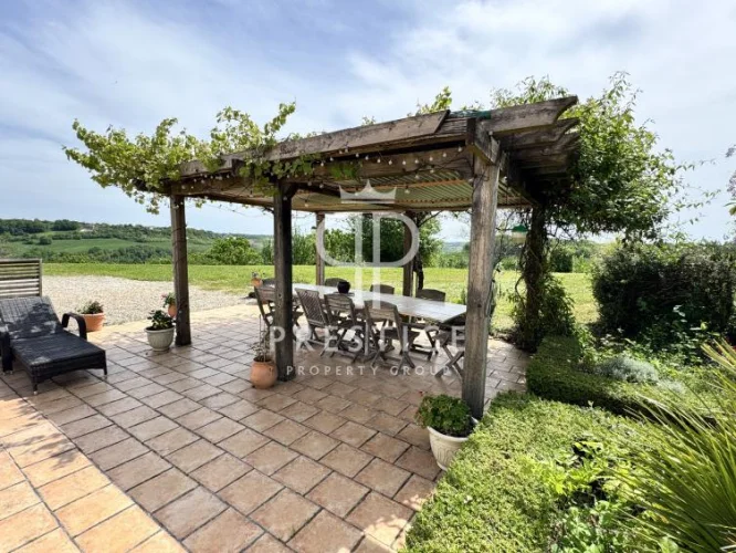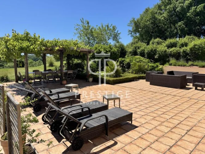 The kitchen in the main house, carefully designed and equipped, is the heart of this residence. There are unobstructed views, terraces, a pergola, and gardens with shrubs and lawns.