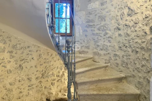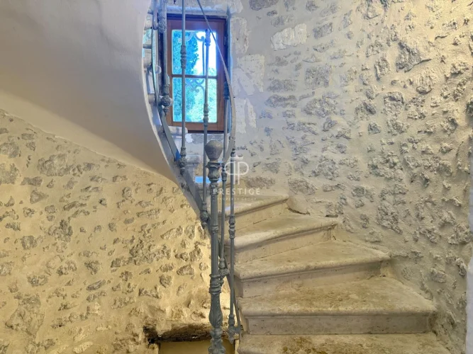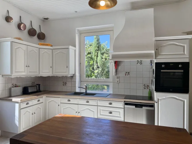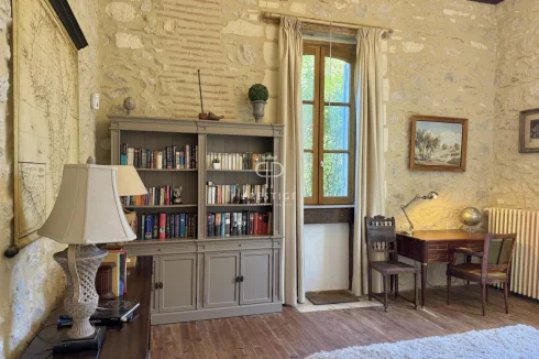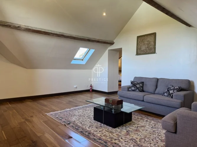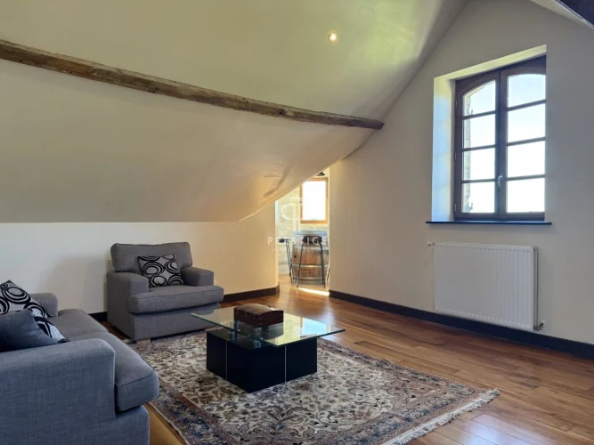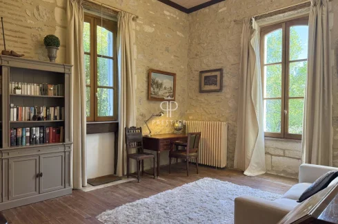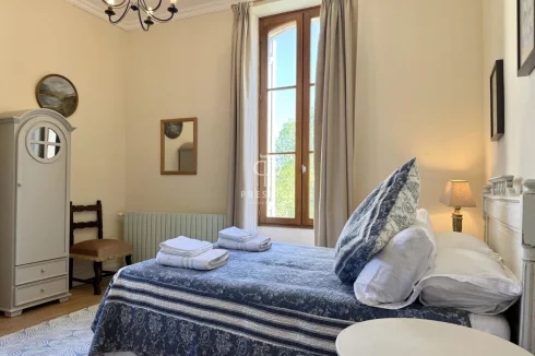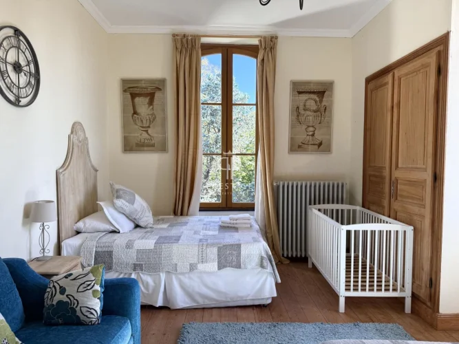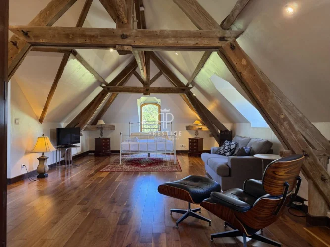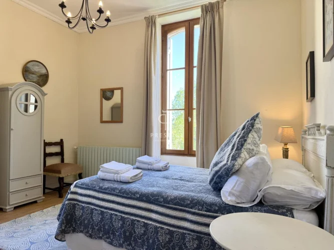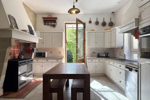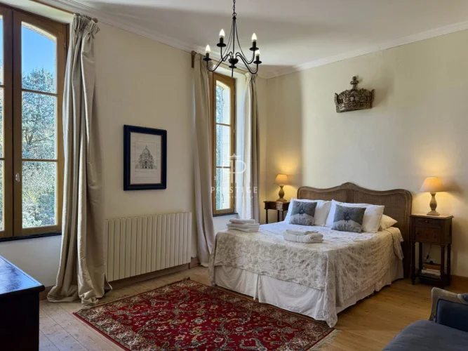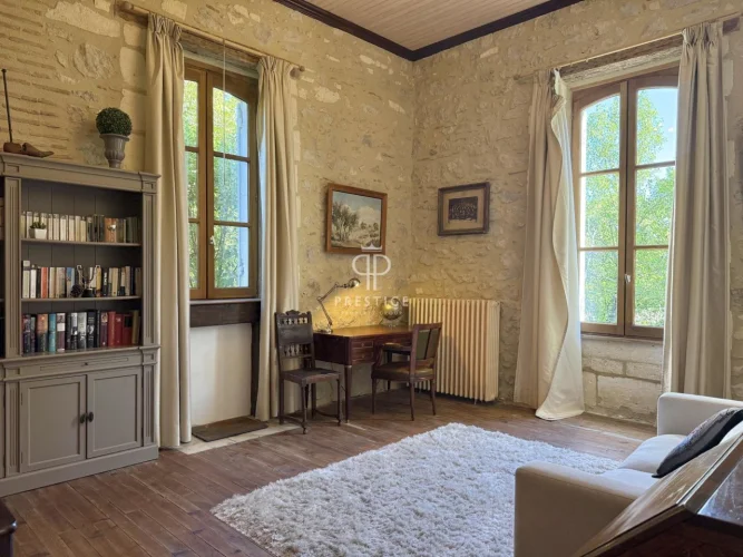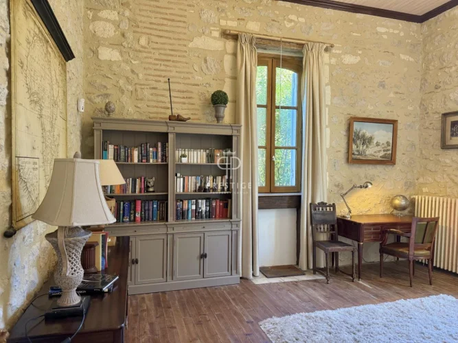 The interior includes a double-height dining room, bathed in light, opens onto a cosy living room and an office that can be converted into an additional bedroom. A fully equipped kitchen offers direct access to the exterior. A snug, features a fireplace and an authentic stained-glass window. The fluidity of the interior circulation leads naturally to the garden and the swimming pool, creating a harmonious setting between interior and exterior.