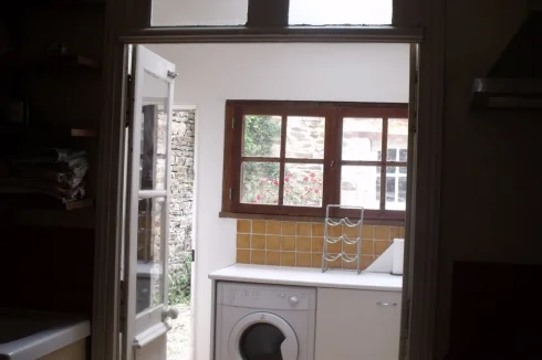 6.9sqm back kitchen with laminate floor, plumbing for dishwasher, plumbing for washing machine, space for tumble drier, modern storage cupboards, central heating radiator and exterior door to courtyard. Arched opening to :