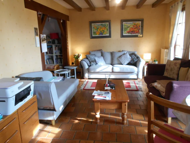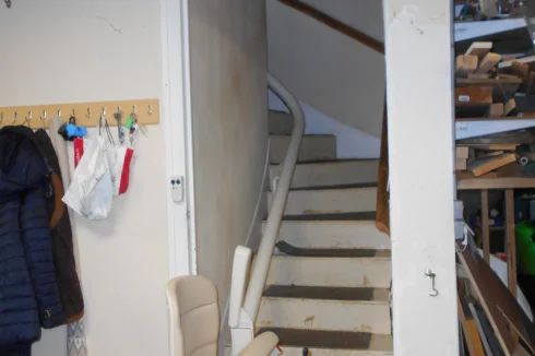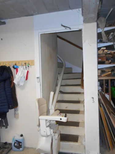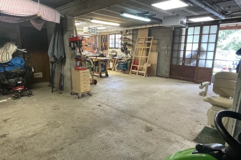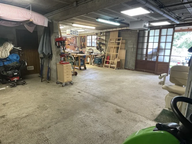 Garage /workshop : c80sqm with concrete floor, glazed bi-fold garage doors and large window. There is an electric stair lift chair from the kitchen to the garage. This large area is divided into :