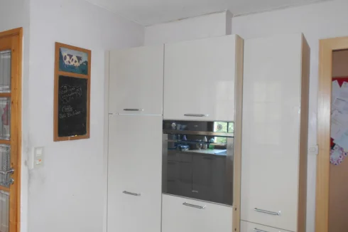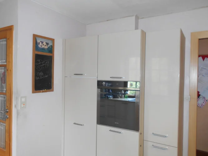11.05sqm kitchen with tiled floor, fully fitted floor and wall mounted cupboards with fitted sink. Built in electric oven and separate gas hob with extractor hood over. Double glazed window to rear and large central heating radiator. Internal door leading to stairs to workshop/garage.