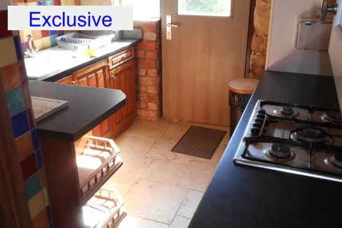 12sqm kitchen with tiled floor, wooden stable style exterior door. Window to front and window to gable. Floor and wall mounted cupboards with tiled splash back. Plumbing for washing machine, plumbing for dishwasher and space for tumble drier and fridge freezer. Built in oven and 5 ring gas hob set in work surface with extractor fan over. Central heating radiator. Leading to :