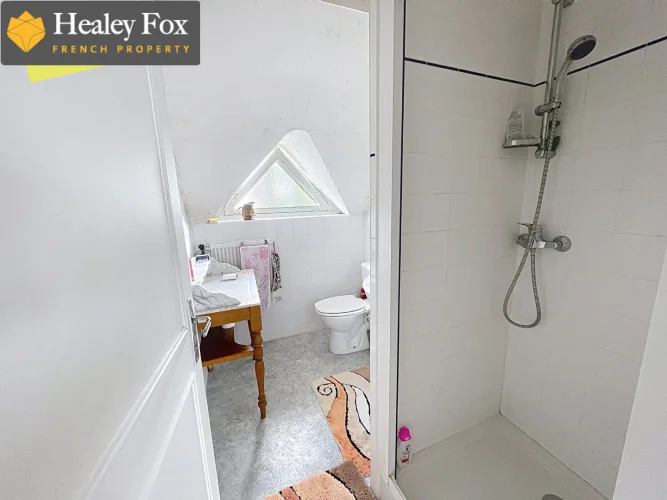 Upstairs: two additional bedrooms, a shower room, an attic, and a hallway.