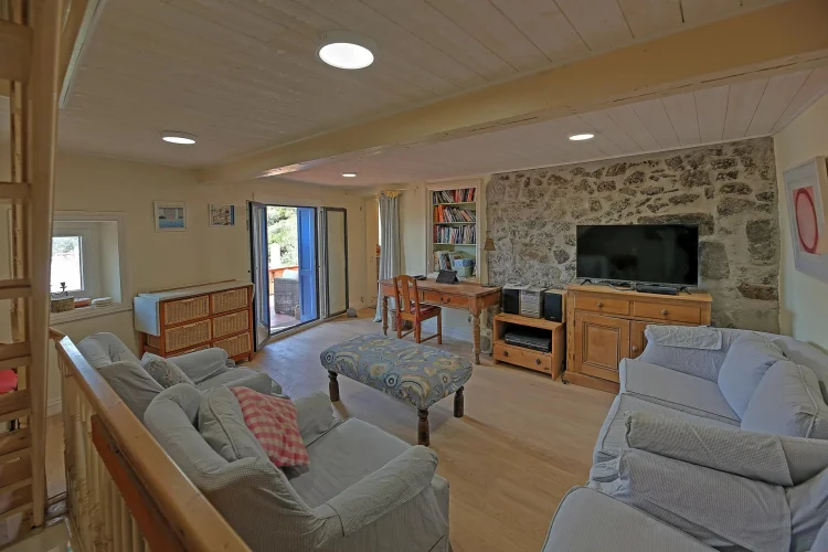 The bright, well-equipped kitchen opens onto a sunny terrace, providing breathtaking views of the surrounding mountains. This outdoor space is perfect for al fresco dining or simply unwinding while soaking in the serene landscape.