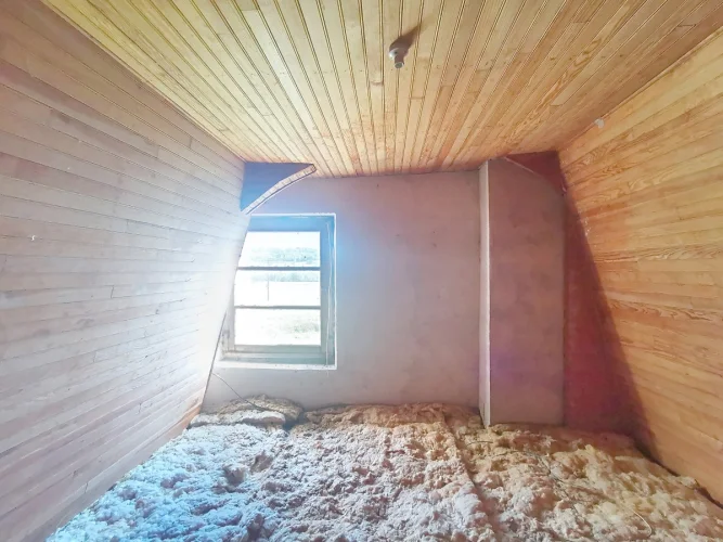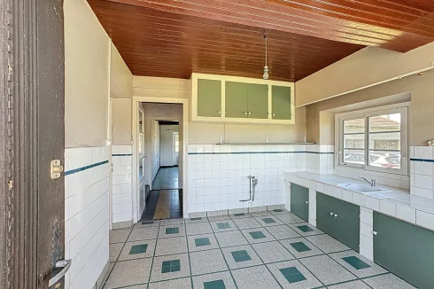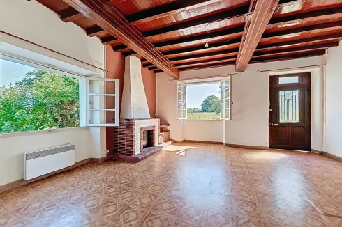 The main entrance opens onto a 22 m² living room with a fireplace and pellet-burning heater. To the left of the entrance is a 22 m² bedroom. The separate kitchen (11 m²) is reached from the living room and it is also accessible via a back door. Next to it is a shower-room and toilet (5 m²) and a second bedroom (15 m²).