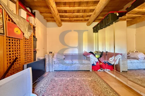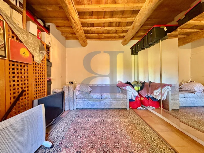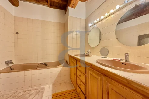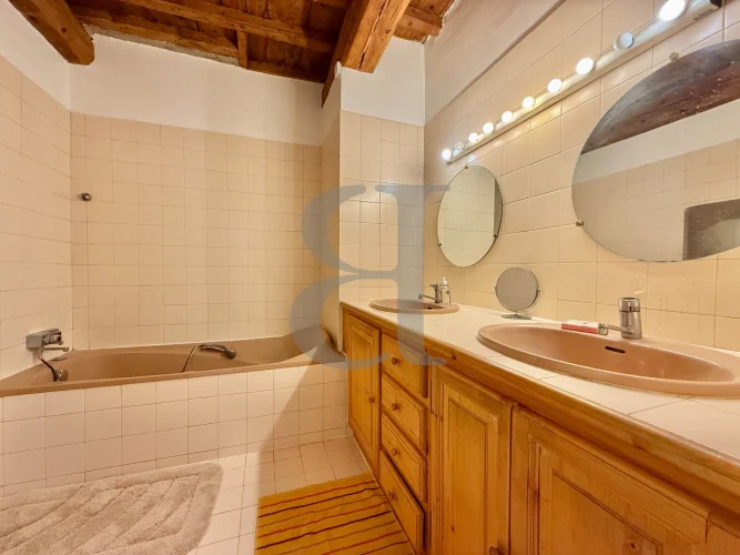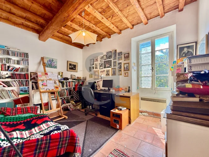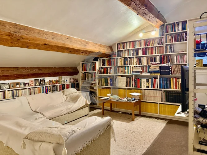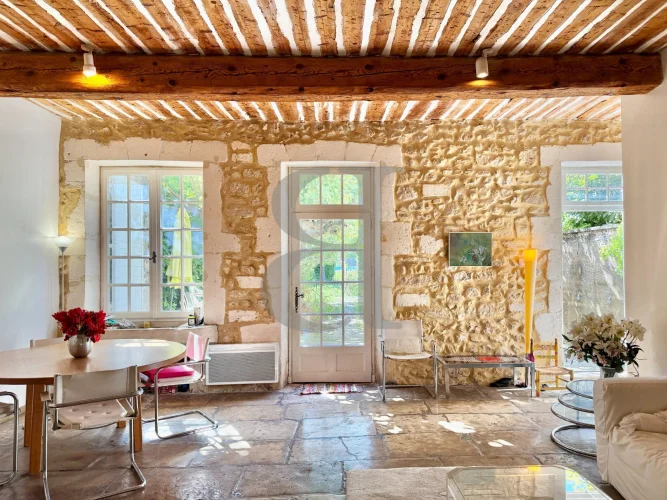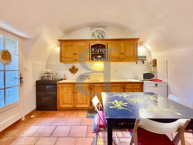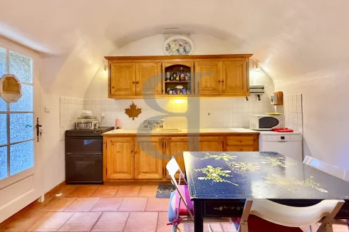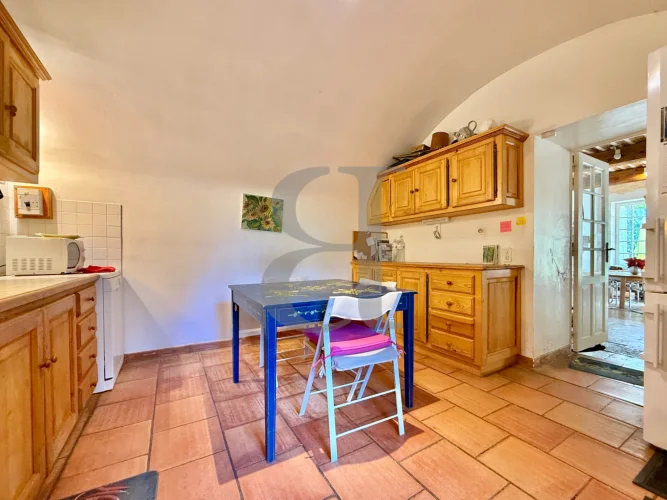The ground floor consists of a large living room of approximately 40 sqm with a large open fireplace, magnificent French ceilings, stone walls and floors, and a charming vaulted kitchen.