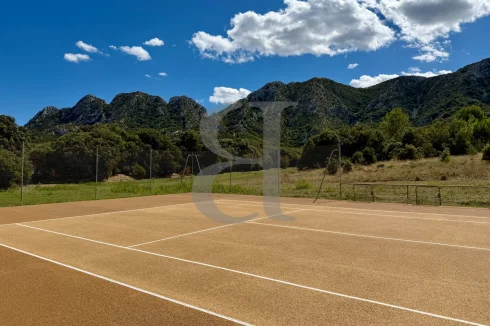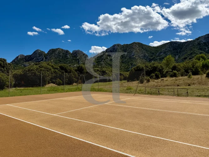 The property benefits from a private garden and exceptional amenities: a tennis court and a 15.5 m x 7.5 m swimming pool, all set in approximately 9 hectares of shared grounds. A covered garage and a storage box complete the property.
