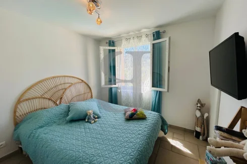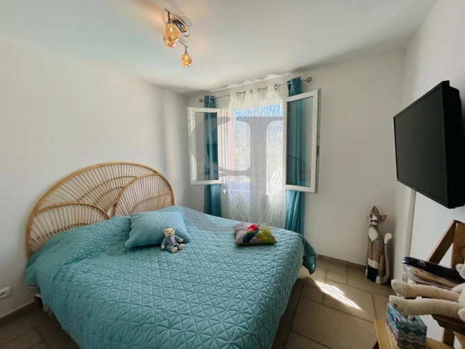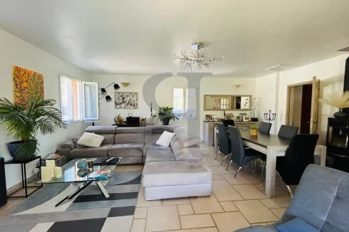 It comprises a beautiful, bright living space with a lounge and open-plan kitchen, offering direct access to a large south-facing terrace, ideal for enjoying sunny days.