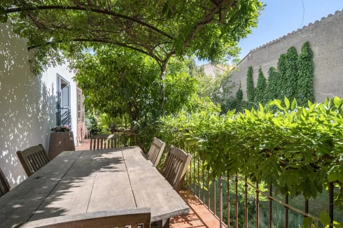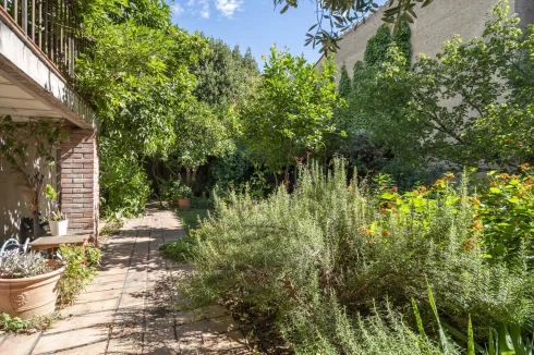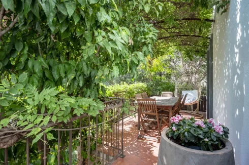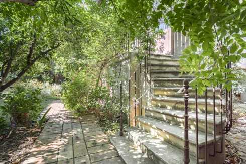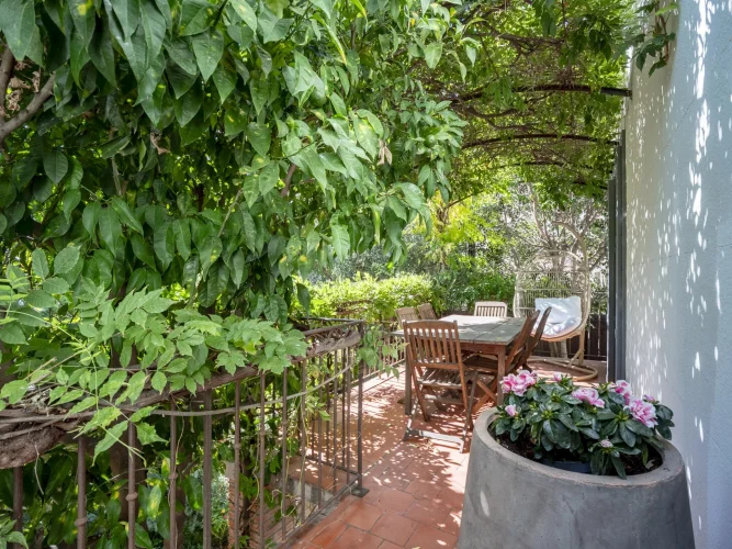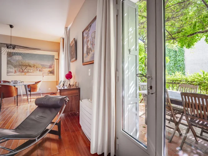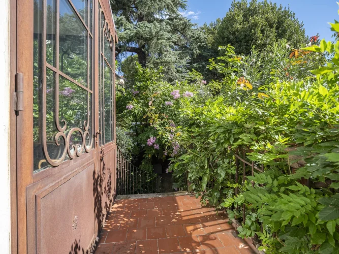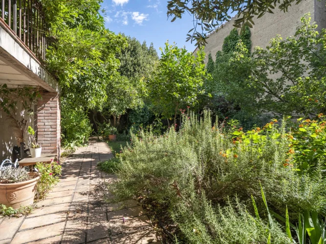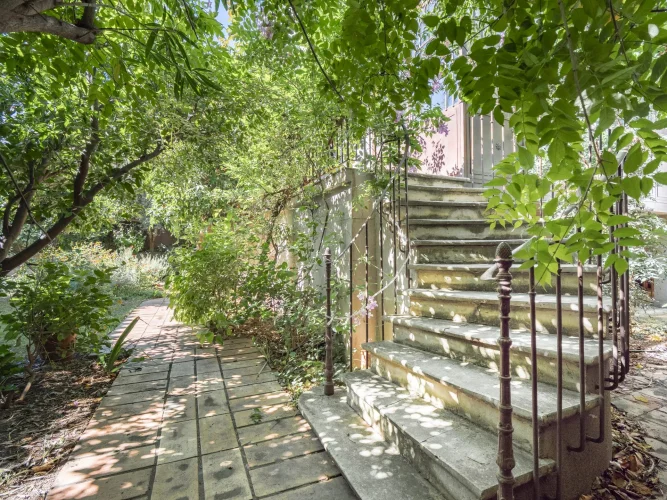 Upon entering, a discreet gate opens onto a magnificent south-facing landscaped garden—a true haven of peace in the city. A period staircase, lined with a wrap-around balcony and a shaded terrace covered in vibrant wisteria, leads to a beautiful custom-made wrought-iron veranda that serves as the main entrance.