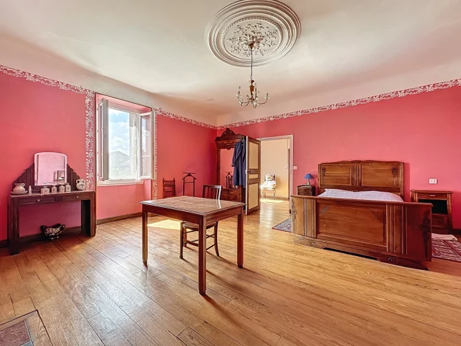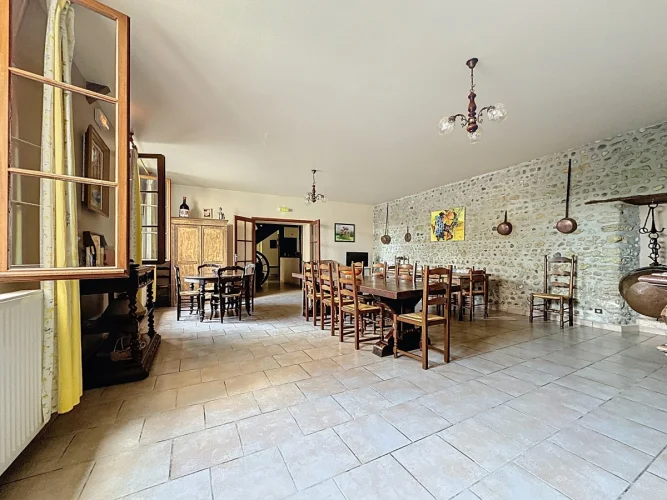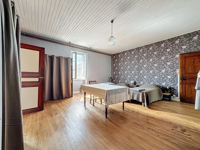 Located in a rural village is this pretty 486m² farmhouse to modernise comprising a living room, sitting room, two kitchens, a washroom, bathroom with shower, four bedrooms, two toilets and a loft. A gîte has a living area, study, laundry, five bedrooms with washrooms and toilet. There is an old abattoir, several areas for storage, a wine cellar and 7900 m² of land.