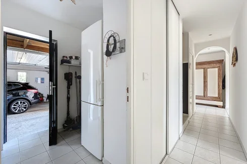 At the end of the hallway, on the left, you’ll find the master bedroom (13.80 m²) with a large built-in wardrobe and, once again, a beautiful mountain view through the bay window. Opposite this bedroom is the bathroom with shower, bathtub, and double sink. A separate toilet with washbasin and a laundry room with direct access to the garage and workshop complete the ground floor.