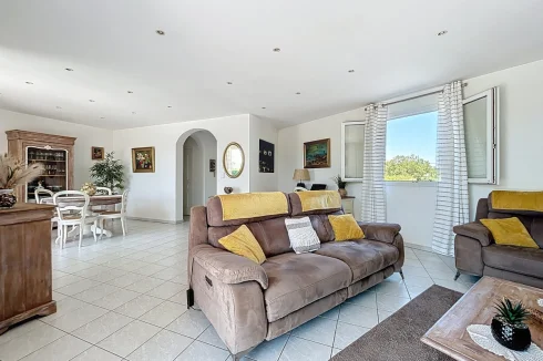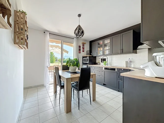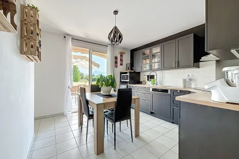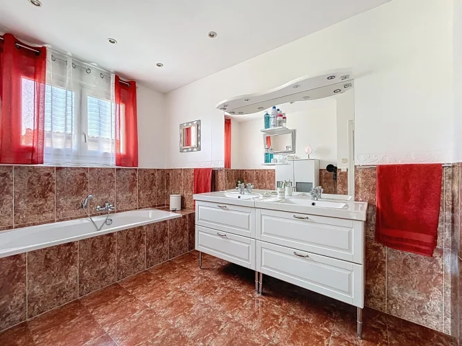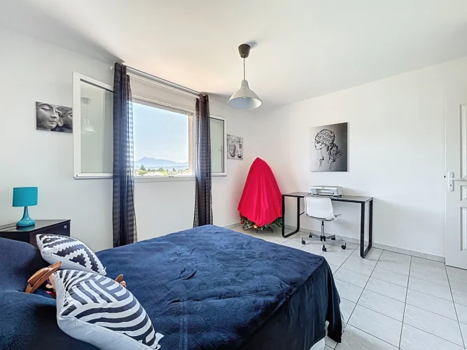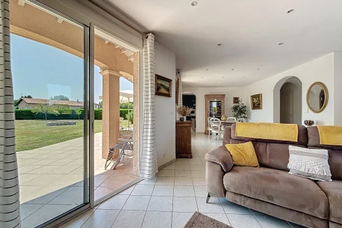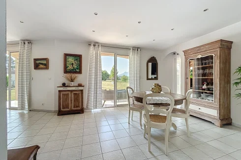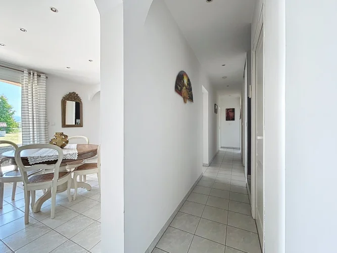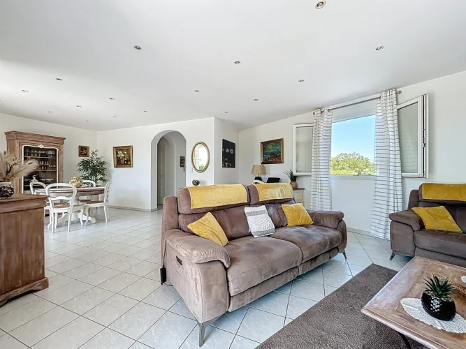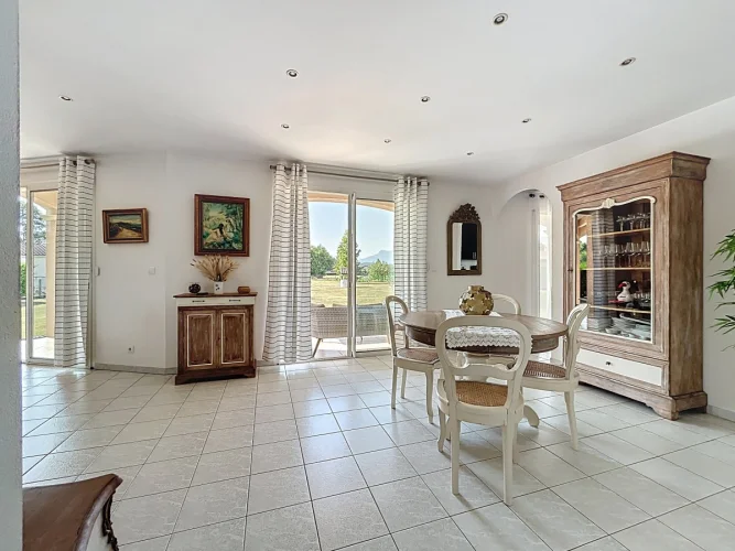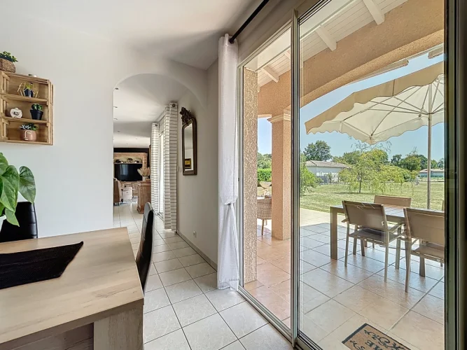 In front of you, the living area (40 m²) is composed of a cozy lounge with its corner fireplace, a dining room, and in line with it, a fully equipped kitchen (12 m²). From these three bright rooms, thanks to their large bay windows, you can access the spacious terrace (50 m²), partly covered, facing south with panoramic views of the Pyrenees. This is the ideal spot to relax or enjoy an aperitif with friends.