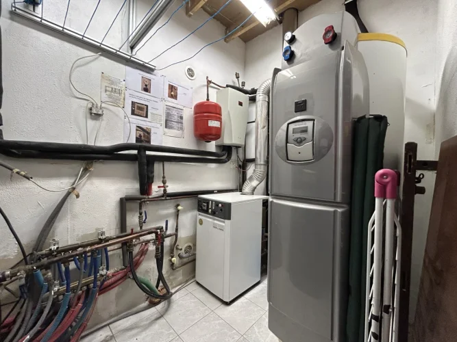 The roof is tiled, the construction is traditional, and the underfloor heating is powered by a mains gas boiler, supplemented by a fireplace insert.
