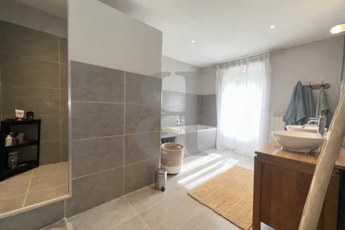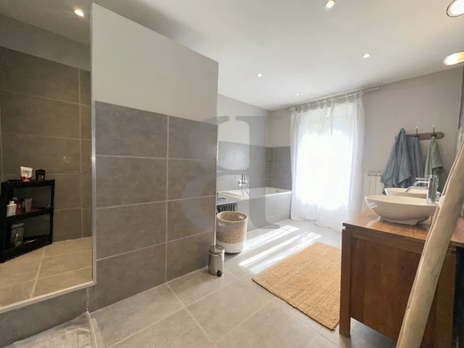 Upstairs, there is a master suite with a bathroom and dressing room, a bedroom with a private shower room, and two other bedrooms (one with independent access) with a shower room.