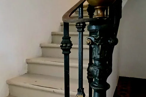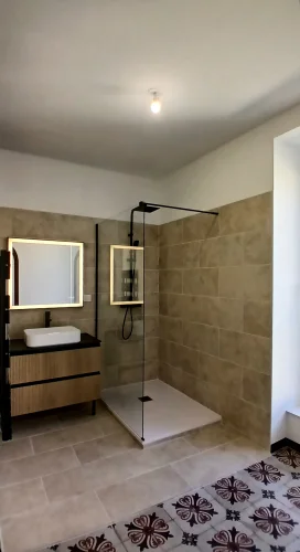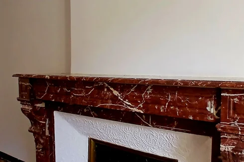 Ground = Entrance hall of 22.83 m2 with its beautiful original stone staircase + lounge (which may also serve as an additional bedroom or office) of 15.58 m2 with decorative marble fireplace + shower room of 3.62 m2 (shower, washbasin unit, WC) + superb luminous through-living room of almost 50 m2 open onto a fully equipped kitchen (central island and ample storage, electric hob, sink, electric oven, microwave, built-in refrigerator, cupboards) with an elegant period granite marble fireplace and French doors leading to the terrace + utility room/pantry of 10.50 m2.