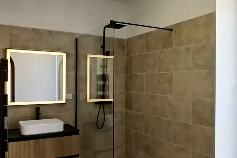 1st = Spacious landing of 12.58 m2 with a large cupboard of 4 m2 + bedroom of 16.46 m2 with decorative wooden fireplace + bathroom of 7.43 m2 (bathtub, double washbasin unit, heated towel rail, WC, storage unit) + bedroom of 16.55 m2 + bedroom of 13.83 m2 with built-in wardrobe + master suite of 27 m2 with bedroom, dressing area and en-suite shower room (walk-in shower, washbasin unit, heated towel rail).