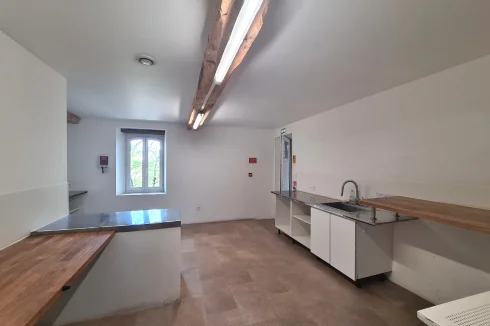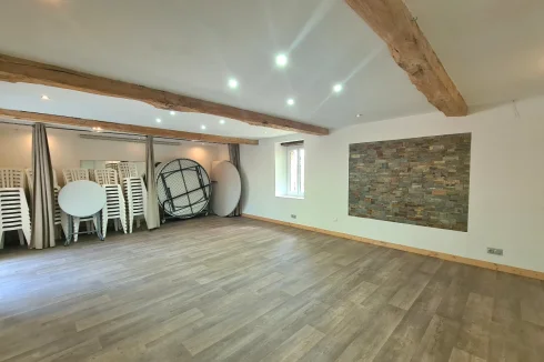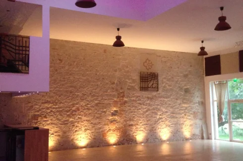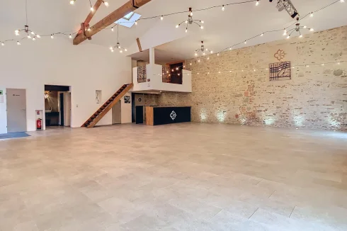 Ground = Wedding/anniversary room of 145 m2 (high ceiling of more than 6m) + bar area of 10 m2 + leisure room of 42 m2 (dance, yoga:) + changing room of 18 m2 (3 WC, one with accessibility for people with reduced mobility and 1 shower) + kitchen of 22 m2 (space for the caterer upto ERP standards).