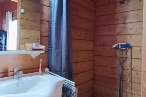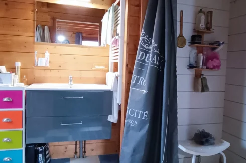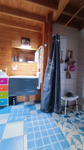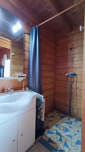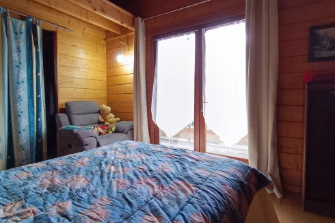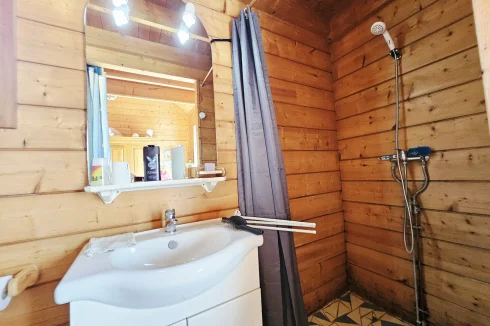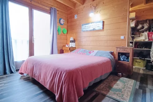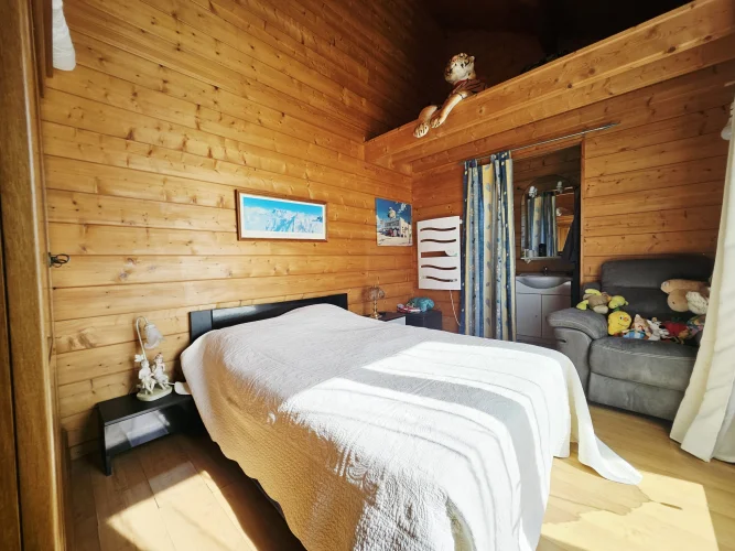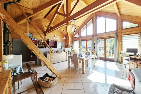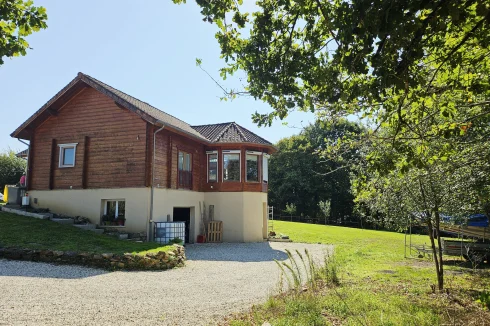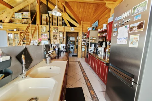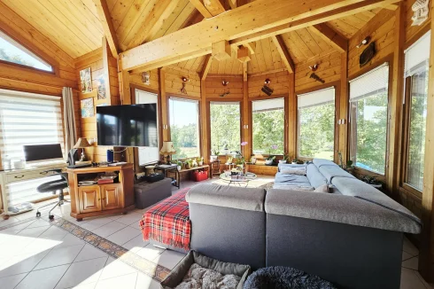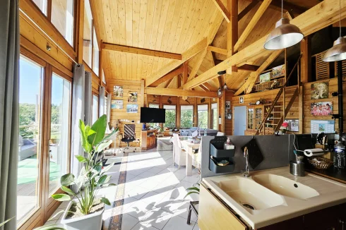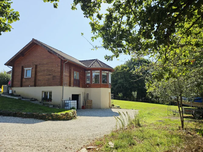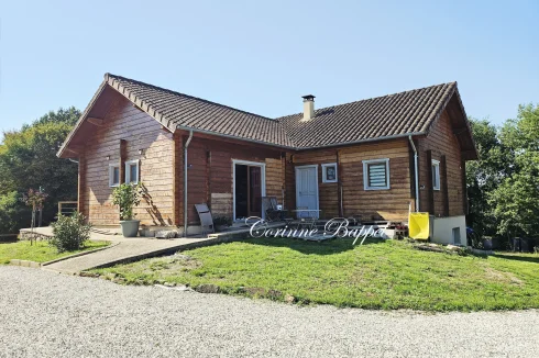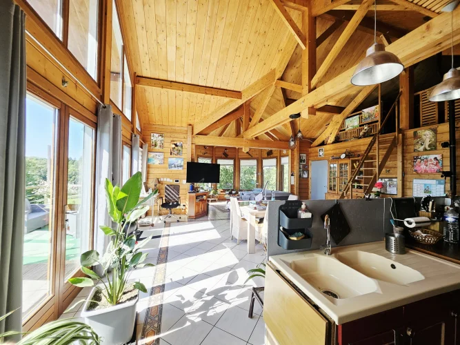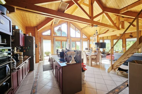 Built in 2004 on a concrete block basement, its living space is constructed of wooden logs. With a living area of approximately 123 m², the living room/kitchen offers a very generous volume of approximately 62 m² with a bow window, and a mezzanine that can be used as a bedroom, library, etc. The three bedrooms have a private bathroom and toilet, as well as a spacious dressing room for one of the three. Finally, the pantry/laundry room is a real asset in the living area.