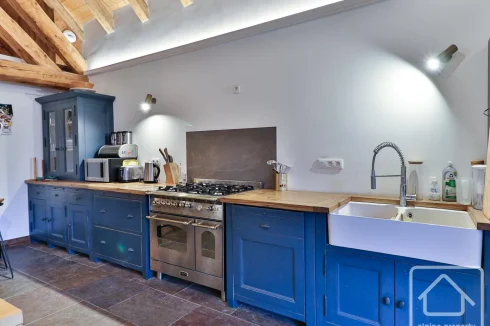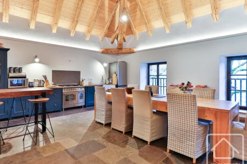 The private apartment, just recently renovated, on the top floor is one of the property’s highlights. Showcasing soaring 10-meter-high ceilings and measuring approximately 190 m2, it offers expansive living areas, an open-plan kitchen and dining space, and several bedrooms. This exceptional space can easily be integrated with the main house or used independently as a stand-alone area offering two separate spaces for rentals.