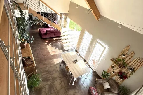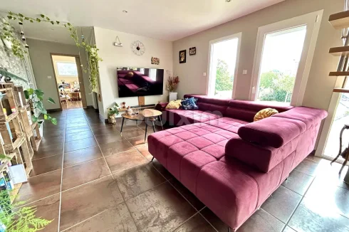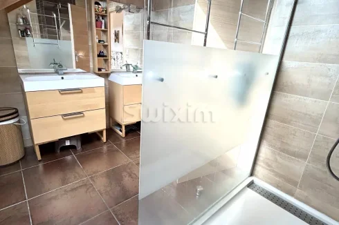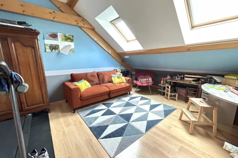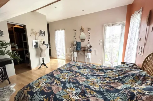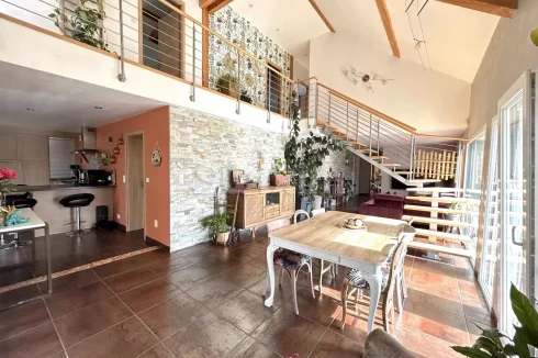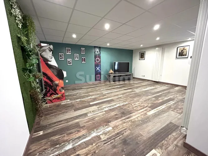 Ref 19185 TF - MOISSEY - Contemporary house of 234m2 of living space, on an enclosed plot of over 1000m2. On the ground floor, a large living room of over 60m2 with its fitted kitchen opening directly onto the terrace, a bedroom, toilet, and access to the 46m2 double garage. Upstairs, four attic bedrooms, a shower room, toilet, and two terraces. In the basement, a large games room, shower room with whirlpool bath, laundry room and storeroom. Underfloor heating via a heat pump, water softener, central vacuum system...