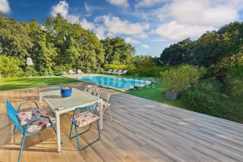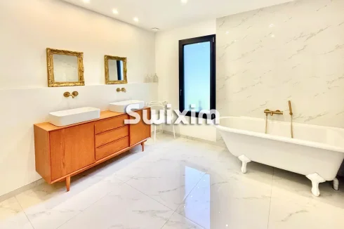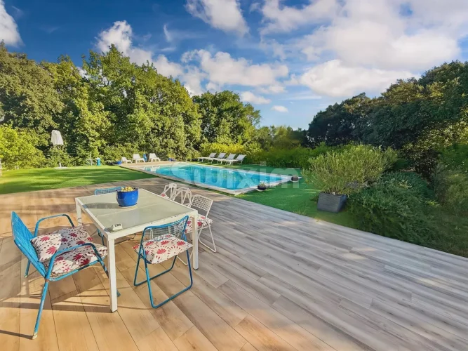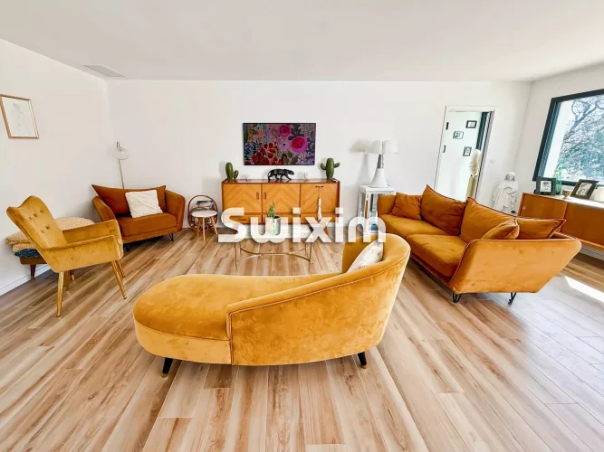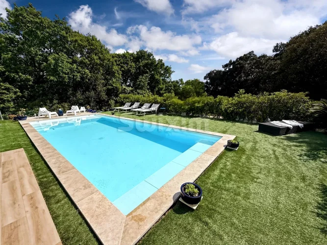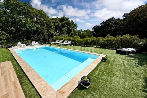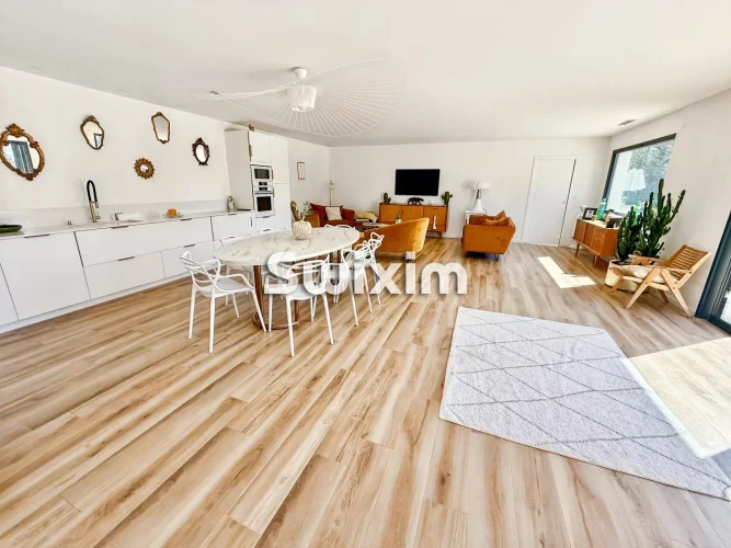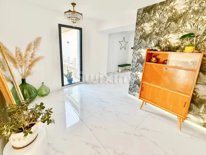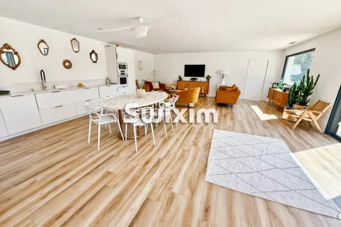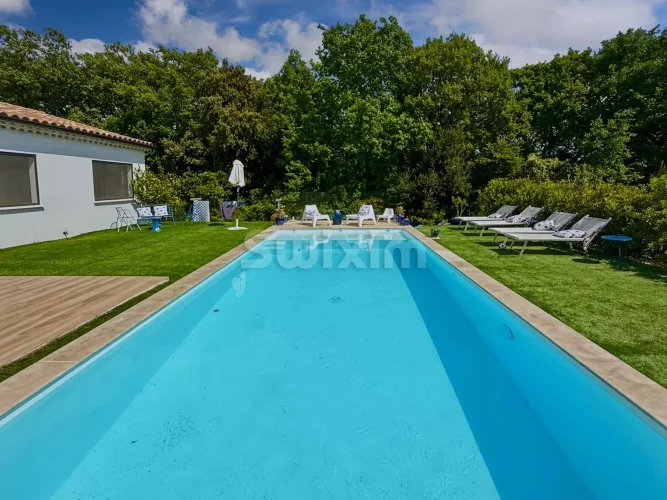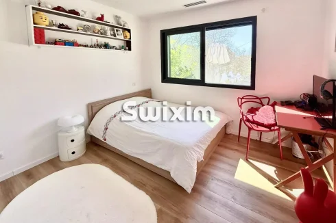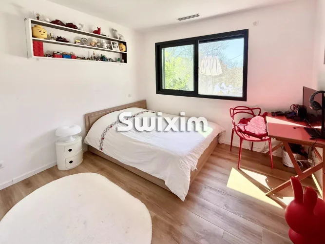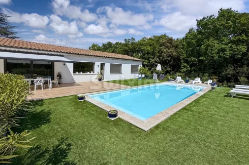 Ref 2346MF: Bourg Saint Andéol, superb contemporary single-story villa with 5 bedrooms, garage, and swimming pool! Let yourself be charmed by its high-end, fully equipped kitchen (hob with integrated extractor hood). It offers a beautiful 70m² living room that opens onto a spacious terrace with a swimming pool! Entirely on one level, it has 5 bedrooms in total (including 2 very spacious ones). A 25m² master suite with a walk-in shower and dressing room. A 26m² bedroom/cinema room with a video projector and integrated home theater system with independent access. A sleeping area with 3 beautiful bedrooms and a spacious bathroom. Laundry room, 26m² garage. Large gravel courtyard (ideal for camper vans). Motorized gate. Ducted air conditioning, electric shutters, and sliding bay windows. Beautiful enclosed and wooded grounds with an automated 10x5m salt-water pool (roller shutters and integrated lighting system). This house is a true gem, harmoniously combining modernity and comfort.