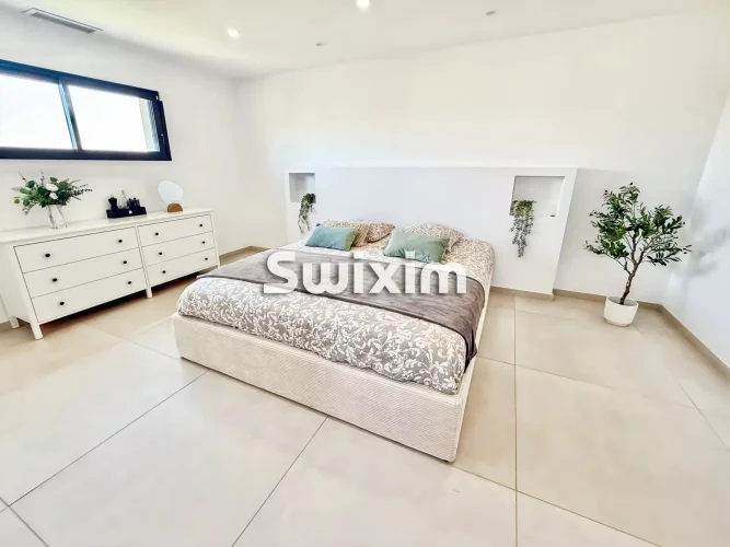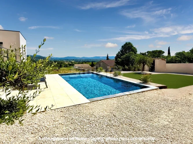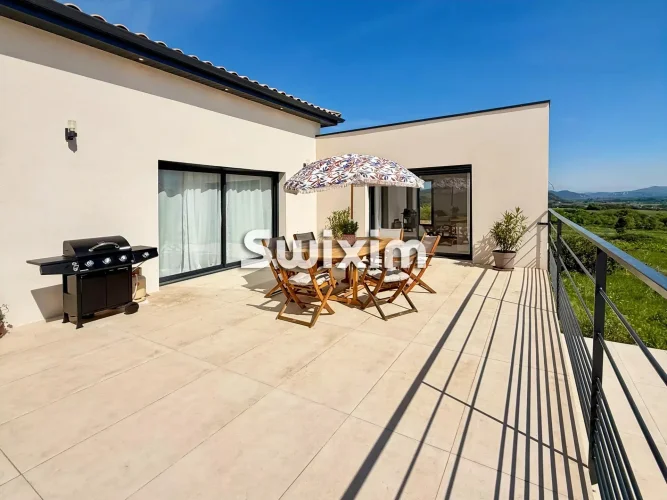 Ref. 2350MF: Bourg Saint Andéol, contemporary villa with swimming pool and unobstructed views! It offers a living area of approximately 80m² with a beautiful kitchen, a spacious dining room, and a magnificent living room overlooking the vineyards. This comfortable villa offers 3 bedrooms (possibility of 4 with the insulated and heated garage). A master suite with a private bathroom and custom-made dressing room. Bathroom with shower and bathtub. Pantry/laundry room. Beautiful 30m² tiled garage, insulated and heated. Ducted air conditioning. Electric shutters. Thermodynamic hot water tank. Beautiful 8m x 4m salt-water swimming pool with a pleasant tiled terrace and superb views! Large gravel courtyard (possibility of parking several vehicles/campervans).
