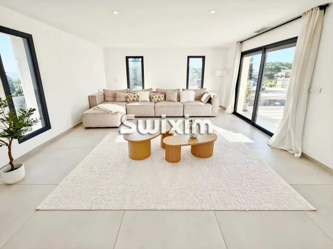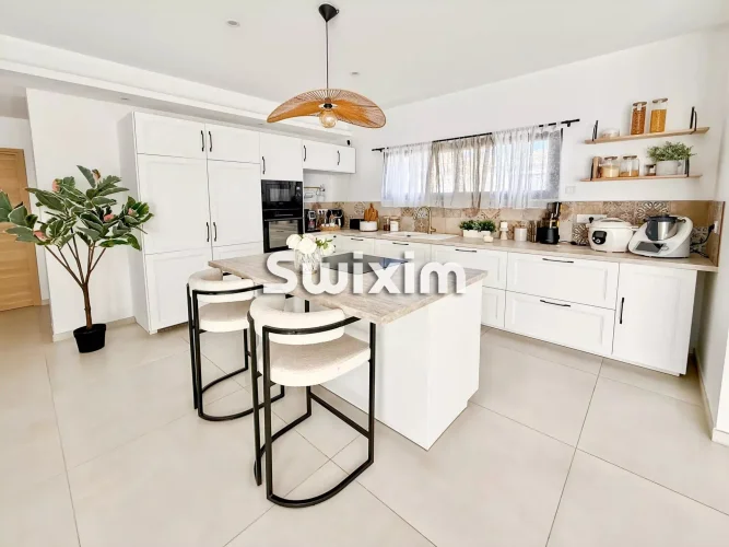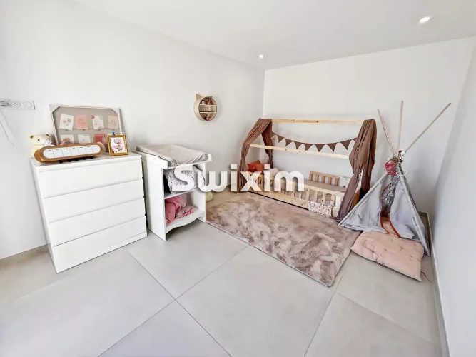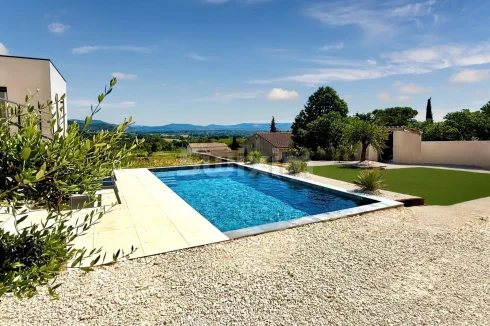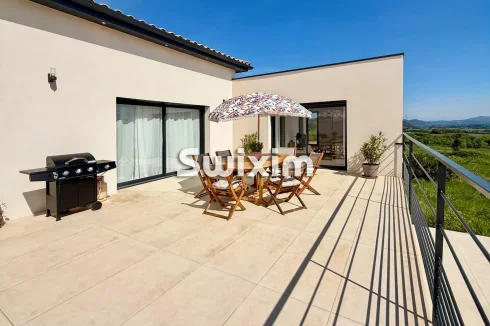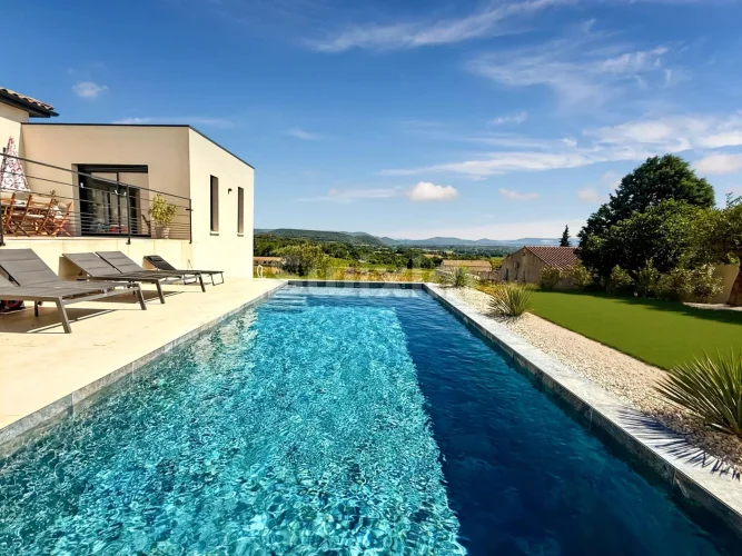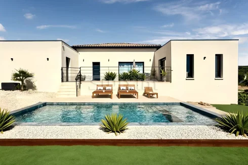Ref. 2364MF: Bourg Saint Andéol, contemporary villa with swimming pool and unobstructed views! It offers a living area of approximately 80m² with a beautiful kitchen, a spacious dining room, and a magnificent living room overlooking the vineyards. This comfortable villa offers 3 bedrooms (possibility of 4 with the insulated and heated garage). A master suite with a private bathroom and custom-made dressing room. A bathroom with shower and bathtub. A cellar/laundry room. A beautiful 30m² tiled garage, insulated and heated. Ducted air conditioning. Electric shutters. Thermodynamic hot water tank. A beautiful 8m x 4m salt-water swimming pool with a pleasant tiled terrace and superb views! A large gravel courtyard (possibility of parking several vehicles/campervans).