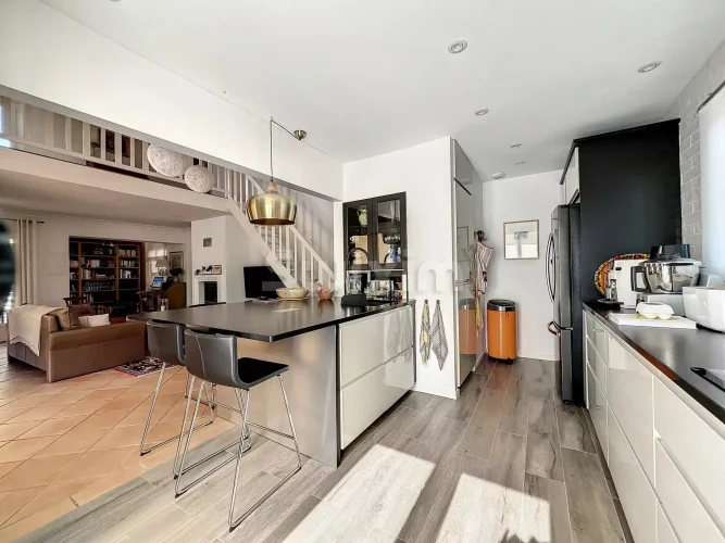 A real cocoon with its beautiful and large living room and a new kitchen opening onto the living room totalling 65m2, a master bedroom with fitted dressing room with direct access to the swimming pool, bathroom with shower and bath, a second bedroom with cupboard. a separate WC.