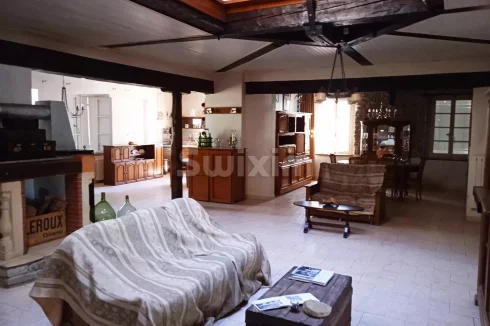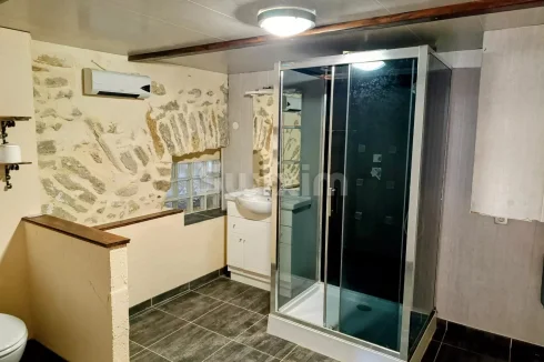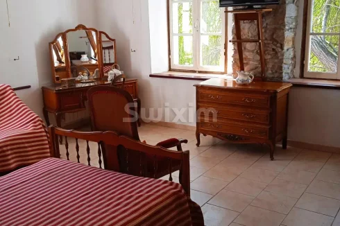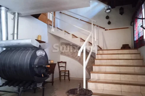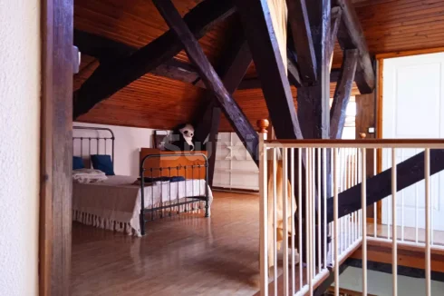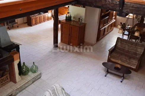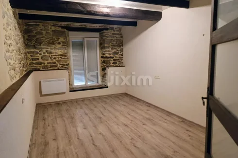 On the ground floor, a fully renovated 90m² apartment combining stone and wood features a living room/kitchen, two bedrooms, and a bathroom.
