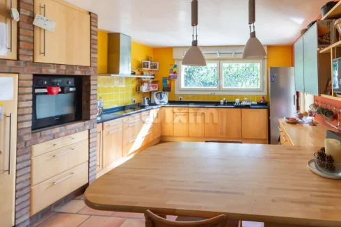 It comprises a large living room with kitchen (equipped) opening onto the dining room and living room with wood-burning stove and terrace, a half-level comprising a bedroom and shower room with toilet, then a half-level higher (1st floor), three bedrooms with access to the balcony, a children's bedroom, a play area, a bathroom with toilet.
