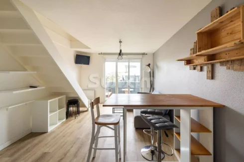 On the ground floor, it features a living room with a fully equipped kitchen opening onto the dining room and its quiet balcony, and a guest toilet. Upstairs, you'll find a mezzanine (which can be converted into an additional room if necessary), a bathroom, and a spacious bedroom.