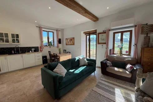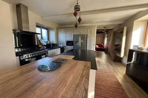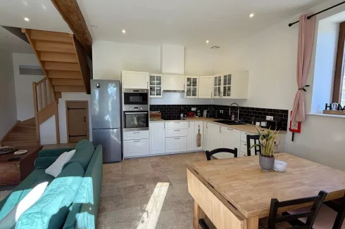 The kitchen opens onto a lovely west-facing terrace, perfect for dining outdoors on sunny days.