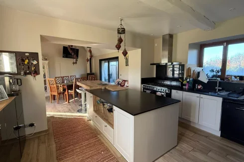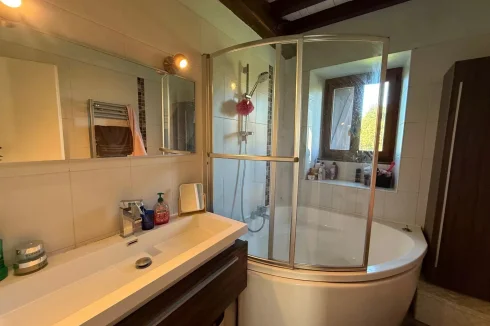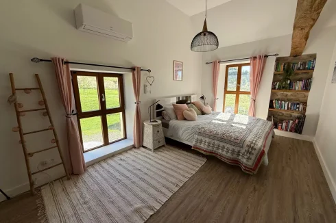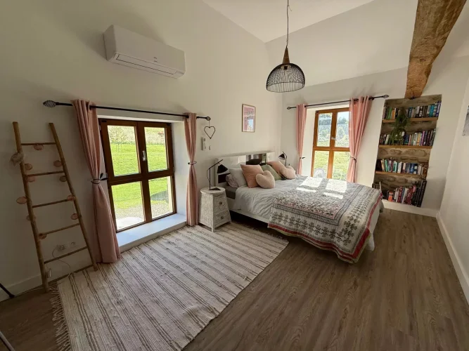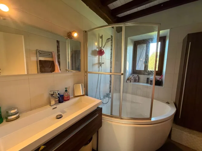The gîte, in excellent condition, comprises a large living area (kitchen, dining room, living room) and a shower room with a WC on the ground floor, and two bedrooms, each with their own bathroom and WC on the first floor.