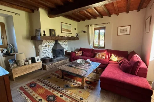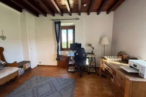 Spread over three levels, the main house offers a living room with a wood-burning stove, a kitchen/dining room with pellet stove, a laundry room and two toilets on the ground floor; two bedrooms (one currently used as an office), a bathroom, and a toilet on the first floor; and two bedrooms on the second floor.