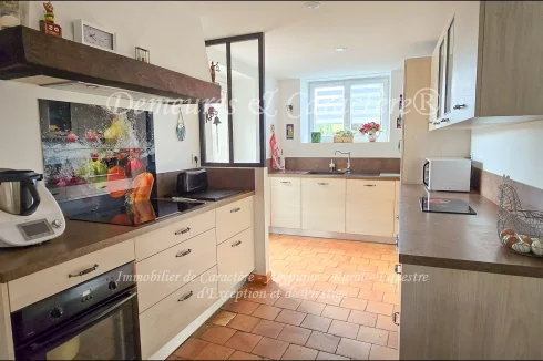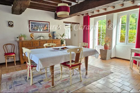 THE ACCOMMODATION (260m2 + utility rooms) is composed on the ground floor (old terracotta floor, exposed beams): Entrance hall; Cloakroom with washbasin and separate toilet; Living room with monumental granite fireplace and recent wood-burning stove + access to terrace and garden; Dining room with access to terrace and garden; AE kitchen (Arthur-Bonnet from 2021) with terrace access; Office or small dining room with fireplace and terrace access on the reception side; Bedroom 1 with private bathroom (vanity unit, bath, shower, toilet); Bedroom 2 (currently a multi-use room: office, ironing and sports). Utility rooms, linking the house and the barn, including: Boiler room/laundry room/Service entrance (with sink and service shower); Linen room/dressing room with large storage. Upstairs: Corridor leading to Bedroom 3 (or large office as currently); Bedroom 4 with closet; Bathroom (2 sinks, bath, toilet, storage - accessible from the hallway, from bedroom 4, and possibly from bedroom 3); Bedroom 5 with closet and powder room (sink, mirror, storage); Bedroom 6 with bathroom (sink unit, bath, toilet); Separate toilet on the landing.