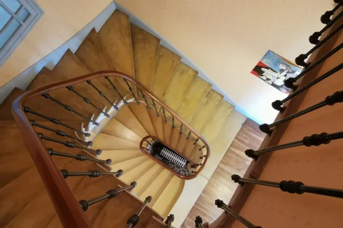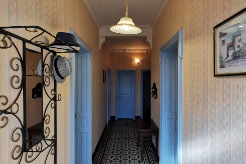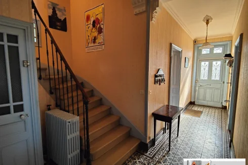 On the right is a dining room, the staircase leading to the first floor, and the staircase leading to the cellar; then, opposite, a large bathroom, with a laundry room and a separate toilet.
