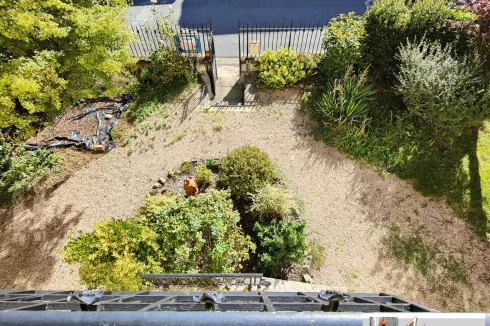 At the end of the garden, a small building with a storage/outbuilding area on the ground floor.