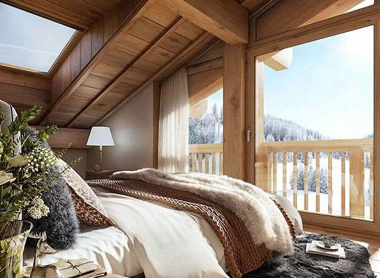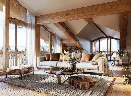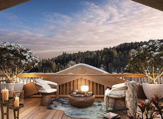 The pinnacle penthouses, including select duplex configurations, are defined by soaring cathedral ceilings that elevate the sense of space and sophistication. Inside, the interiors celebrate a contemporary Alpine aesthetic with artisanal wooden ceilings, bespoke headboards, and premium flooring. Owners have the unique opportunity to personalize their home with a curated selection of finishes tailored to refined tastes.