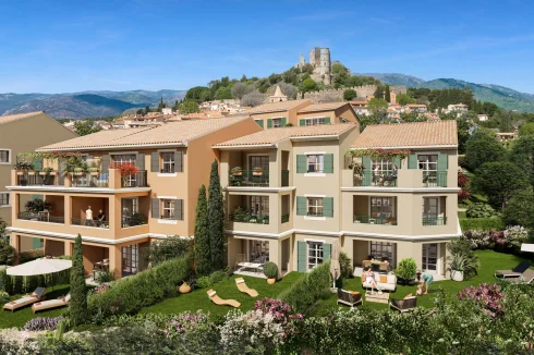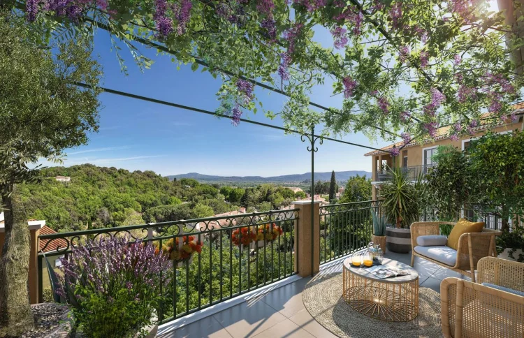 Discover the enchanting charm of Ferries Provençales, a collection of elegant, air-conditioned residences in the picturesque village of Grimaud, nestled in the Var department of the Provence-Alpes-Côte d'Azur region. Each residence blends traditional Provençal aesthetics with modern comforts, featuring ornate shutters and detailed ironwork.