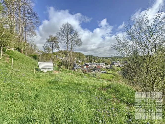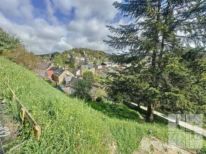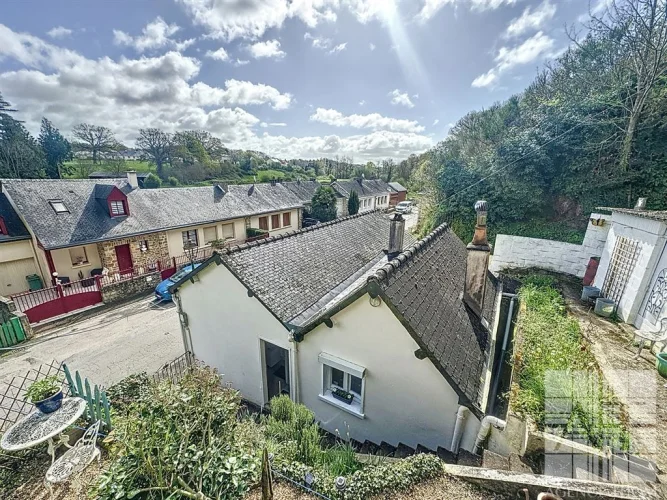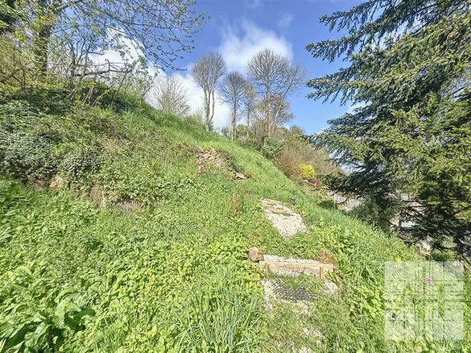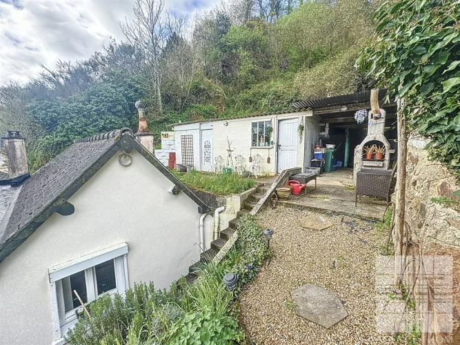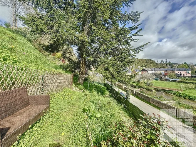 There is a large garden attached to the property, some of which is grass, and steps lead up to the top where panoramic views can be enjoyed. A smaller, flat, grassy area nearer the bottom of the garden is ideal for a terrace and also provides views. The views from the garden reach over the river to the countryside beyond, and across to the pretty village centre framed by the rocky cliffs which provide the charm that this village offers in abundance. Views from the garden show the valley and Mayenne forest beyond.