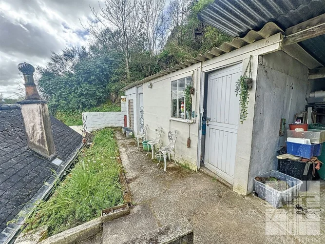 A workshop and shed are accessible from steps to the side of the property and a terraced area offers views over the valley. The workshop and shed are covered with a corrugated asbestos roof. There is also a small, covered terrace area providing an outdoor eating area with barbecue.