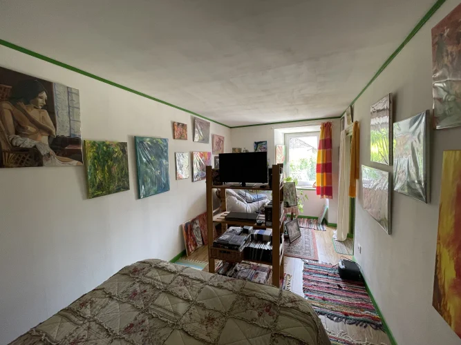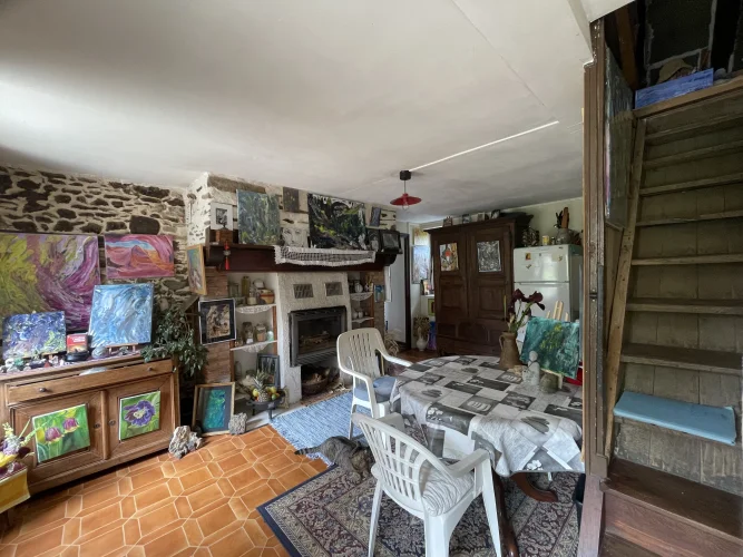 It comprises on the ground floor: a living room with a kitchenette and fireplace, a bedroom, a bathroom, and a toilet.